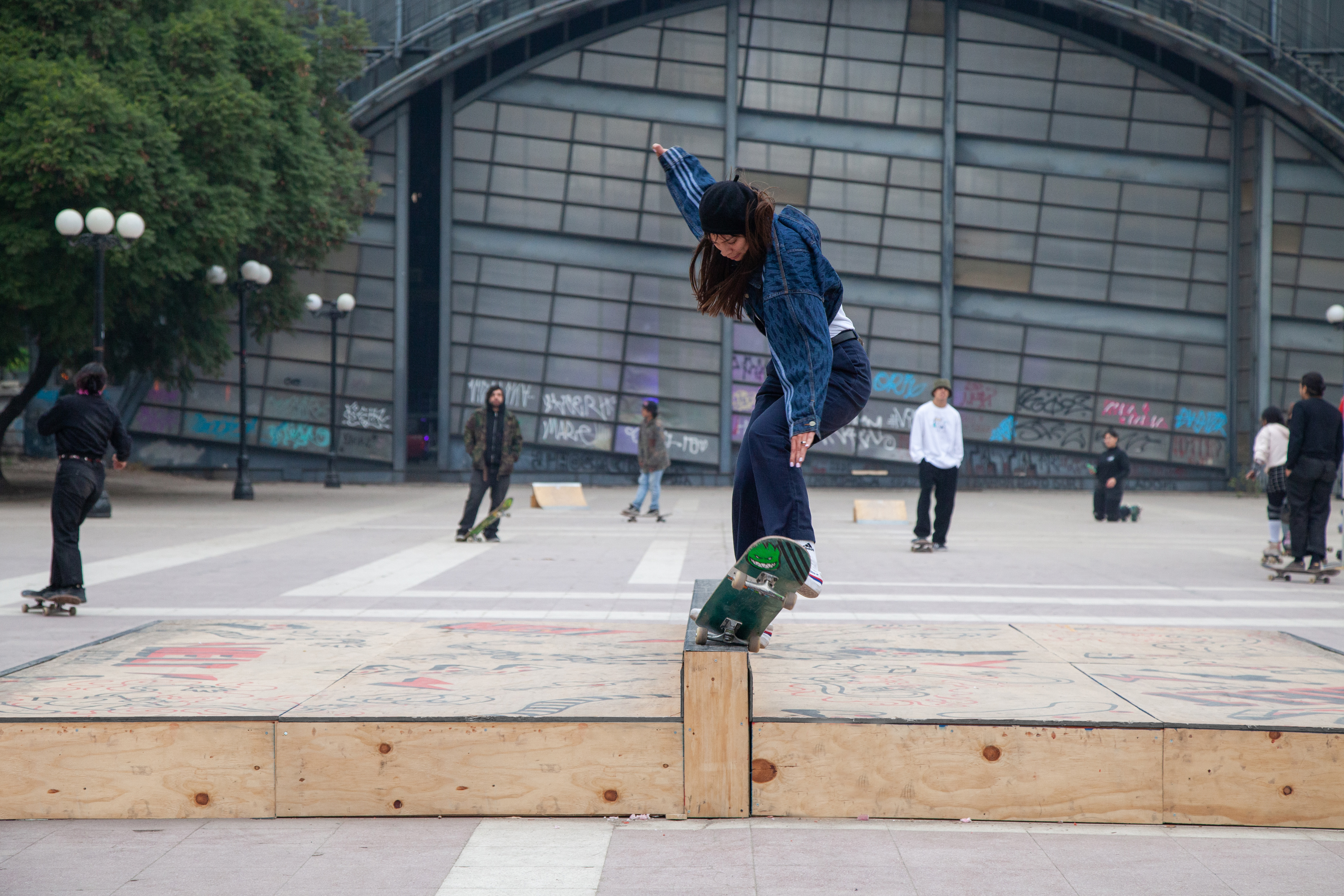 El encargo fue diseñar un módulo temporal para una competencia de skate y pizzas en la explanada trasera del centro cultural Estación Mapocho en Santiago de Chile. La idea de la caja de pizza fue lo más cotizado, como propuesta decidimos abstraernos de lo literal, manteniendo la figura de la caja y haciendo un gesto mínimo en su parte media para abrir un nuevo campo de posibilidades. Su resolución constructiva debía ser lo menos compleja posible para facilitar su construcción, montaje y mantener los márgenes de un presupuesto acotado. Desarrollamos un diseño modular y priorizamos la escala por sobre la complejidad formal. Posteriormente fue intervenida con dibujos y gráficas asociadas a la actividad.