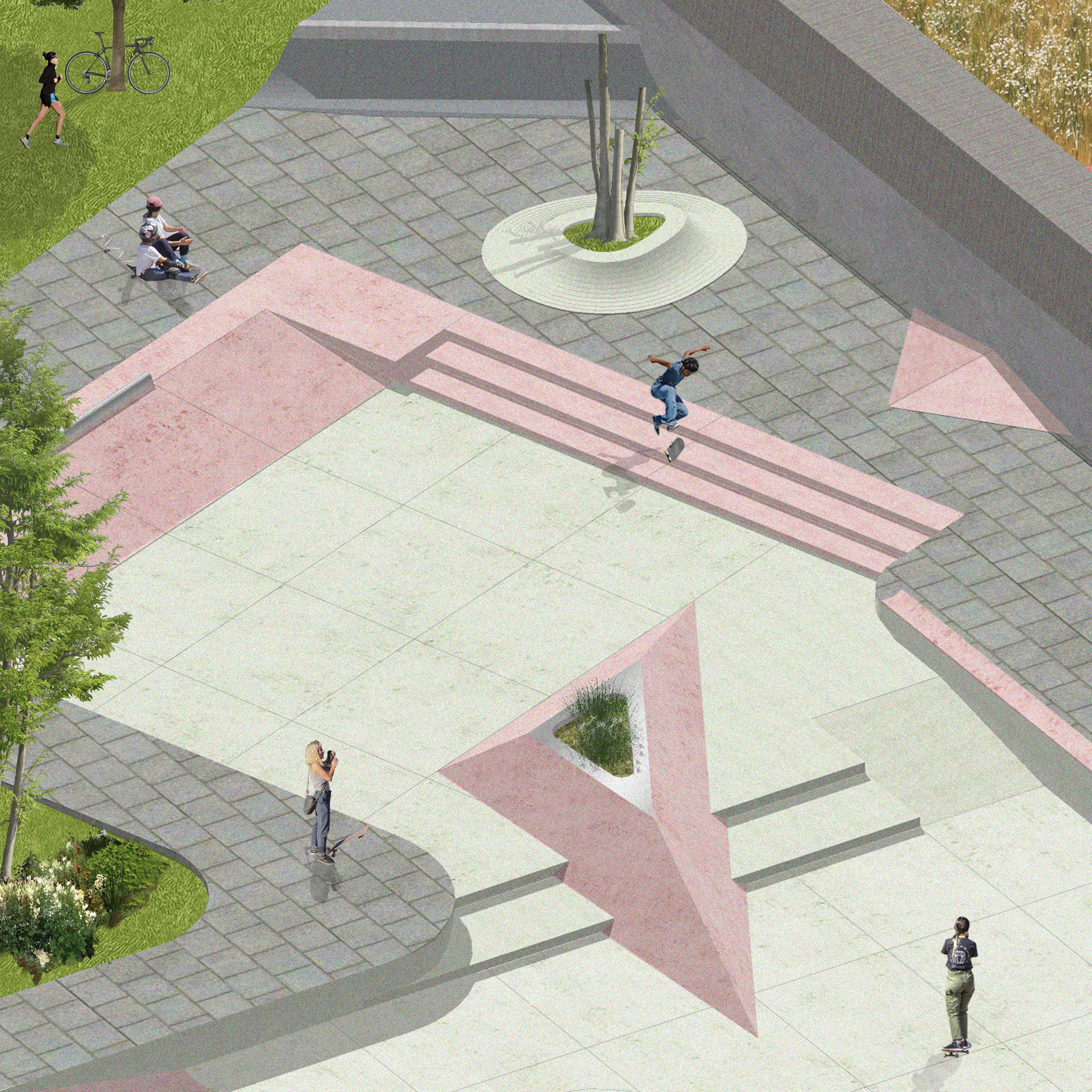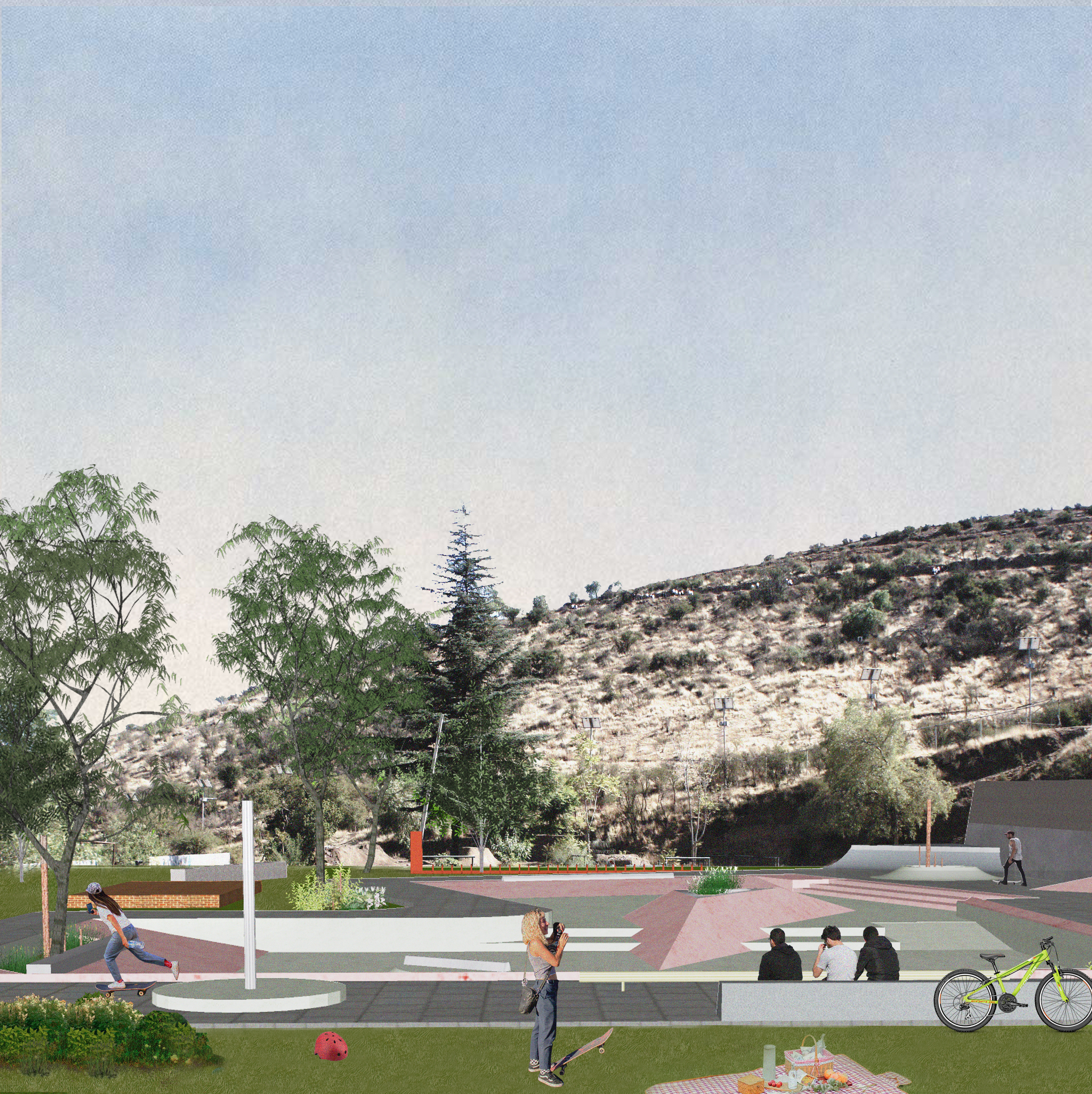 Este proyecto, denominado “Skate Place”, se enmarca dentro de un plan más amplio con múltiples programas, desarrollado por la Fundación Mi Parque, que nos encargó el diseño de la zona destinada al programa de skate. Para esta propuesta, decidimos conservar los vestigios de la piscina preexistente en el lugar y descartamos la idea de diseñar un "skatepark" tradicional. En este proyecto, tuvimos la oportunidad de aplicar varias estrategias y conceptos clave del estudio que consideramos esenciales, como poner en valor una preexistencia, ampliar el concepto de skatepark y abstraer sus formas de uso y configuraciónes, así como trabajar con diversas materialidades y formatos de intervención.